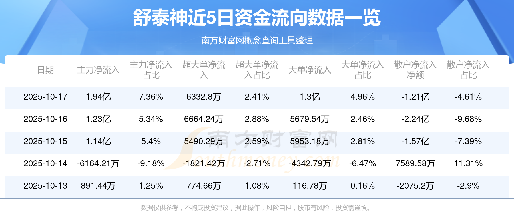 10月17日消息,舒泰神主力资金净流入1.94亿元,超大单资金净流入6332.8万元,散户资金净流出1.21亿元。