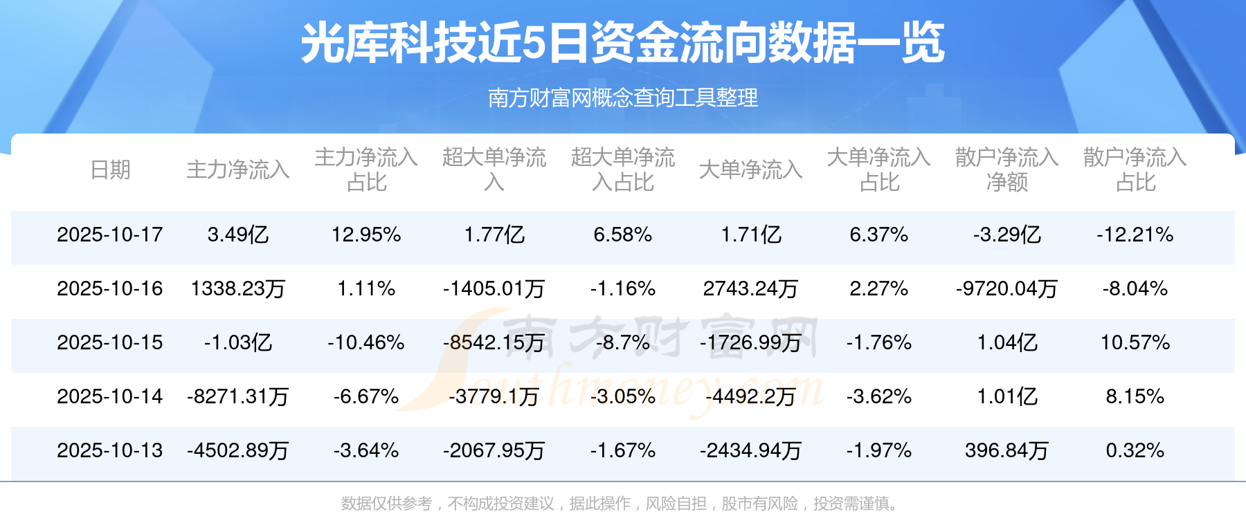 10月17日消息,光库科技资金净流入3.49亿元,超大单资金净流入1.77亿元,换手率10.49%,成交金额26.92亿元。