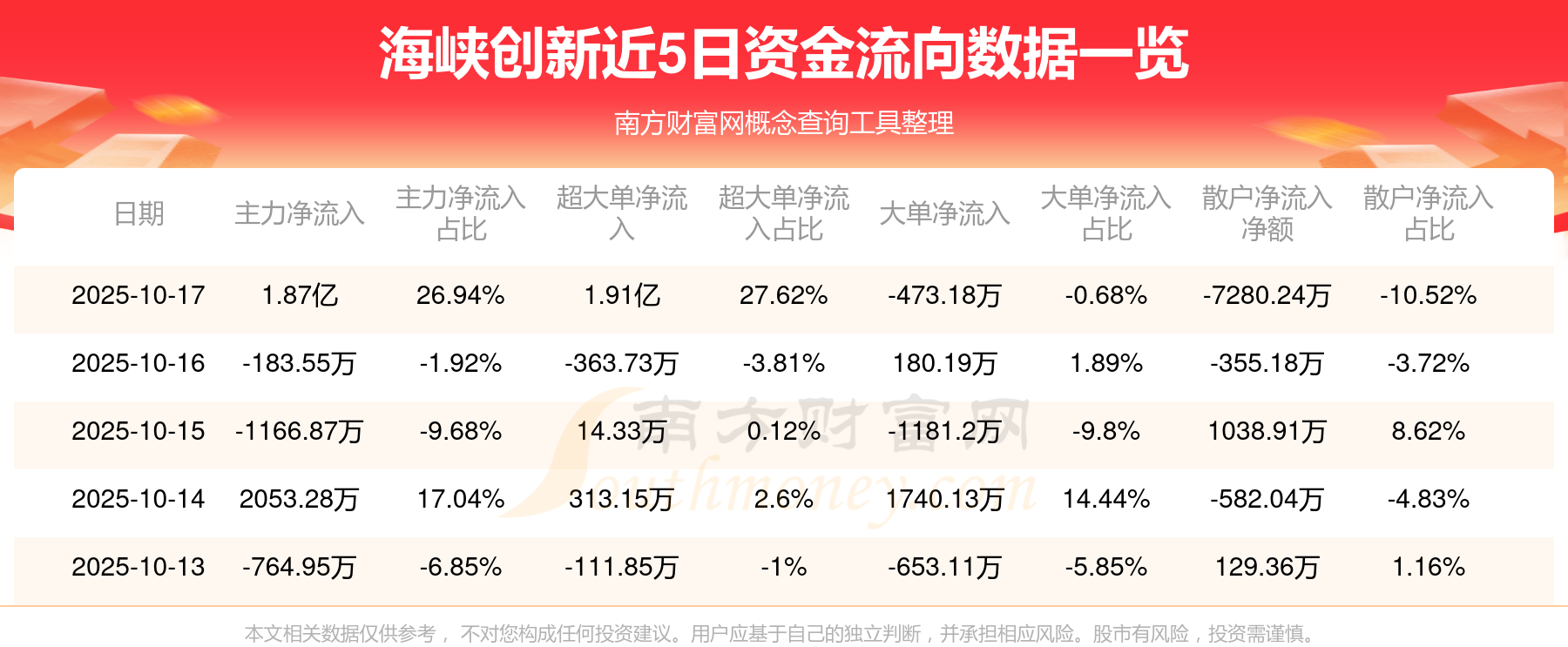 10月17日消息,海峡创新资金净流入1.87亿元,超大单资金净流入1.91亿元,换手率26.02%,成交金额10.53亿元。