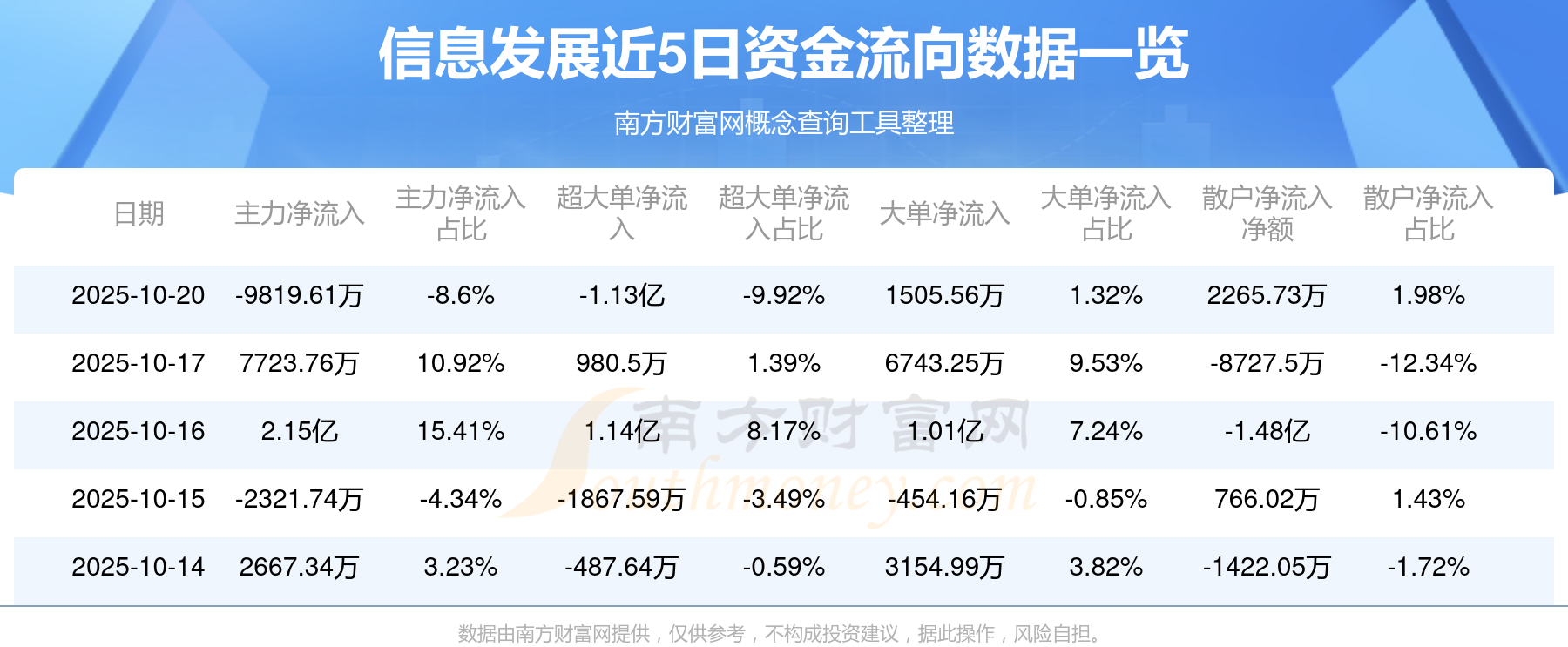 10月20日消息,信息发展主力资金净流出9819.61万元,超大单资金净流出1.13亿元,散户资金净流入2265.73万元。