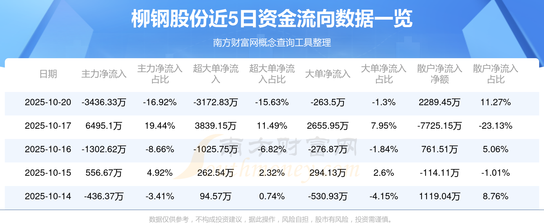 10月20日消息,柳钢股份主力净流出3436.33万元,超大单净流出3172.83万元,散户净流入2289.45万元。
