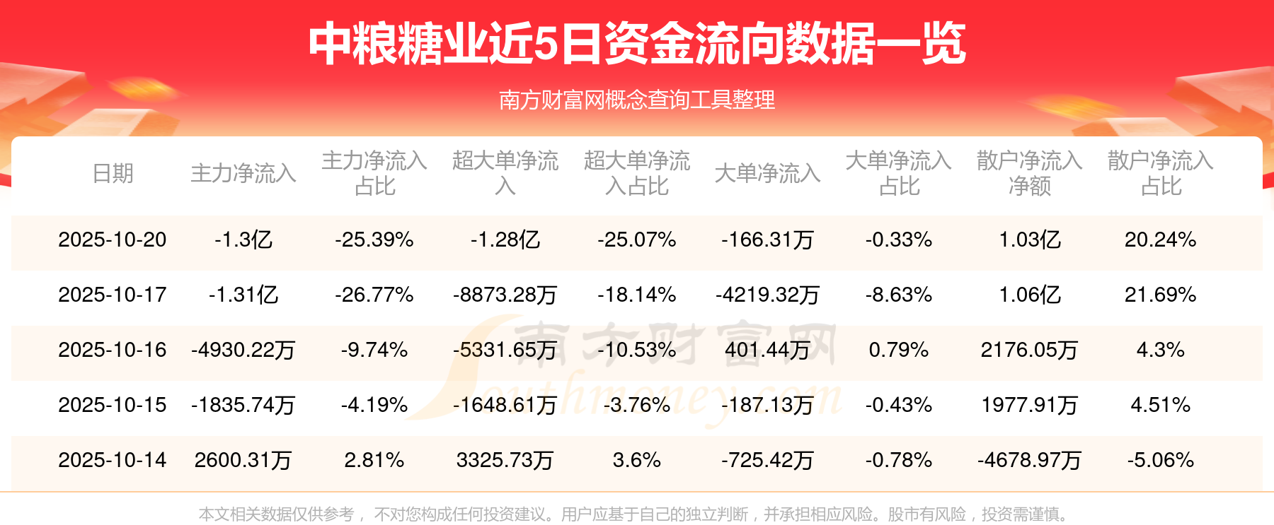 10月20日消息,中粮糖业10月20日主力资金净流出1.3亿元,超大单资金净流出1.28亿元,大单资金净流出166.31万元,散户资金净流入1.03亿元。