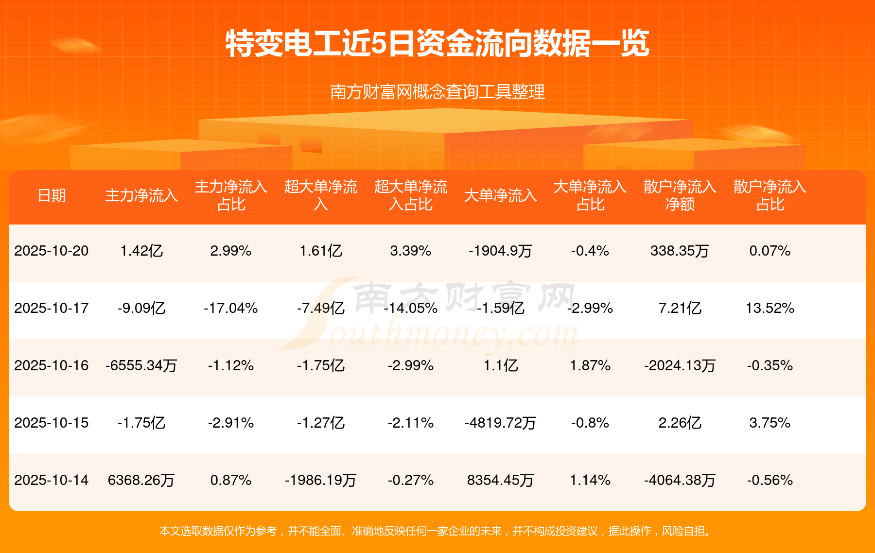 10月20日消息,特变电工10月20日主力资金净流入1.42亿元,超大单资金净流入1.61亿元,大单资金净流出1904.9万元,散户资金净流入338.35万元。