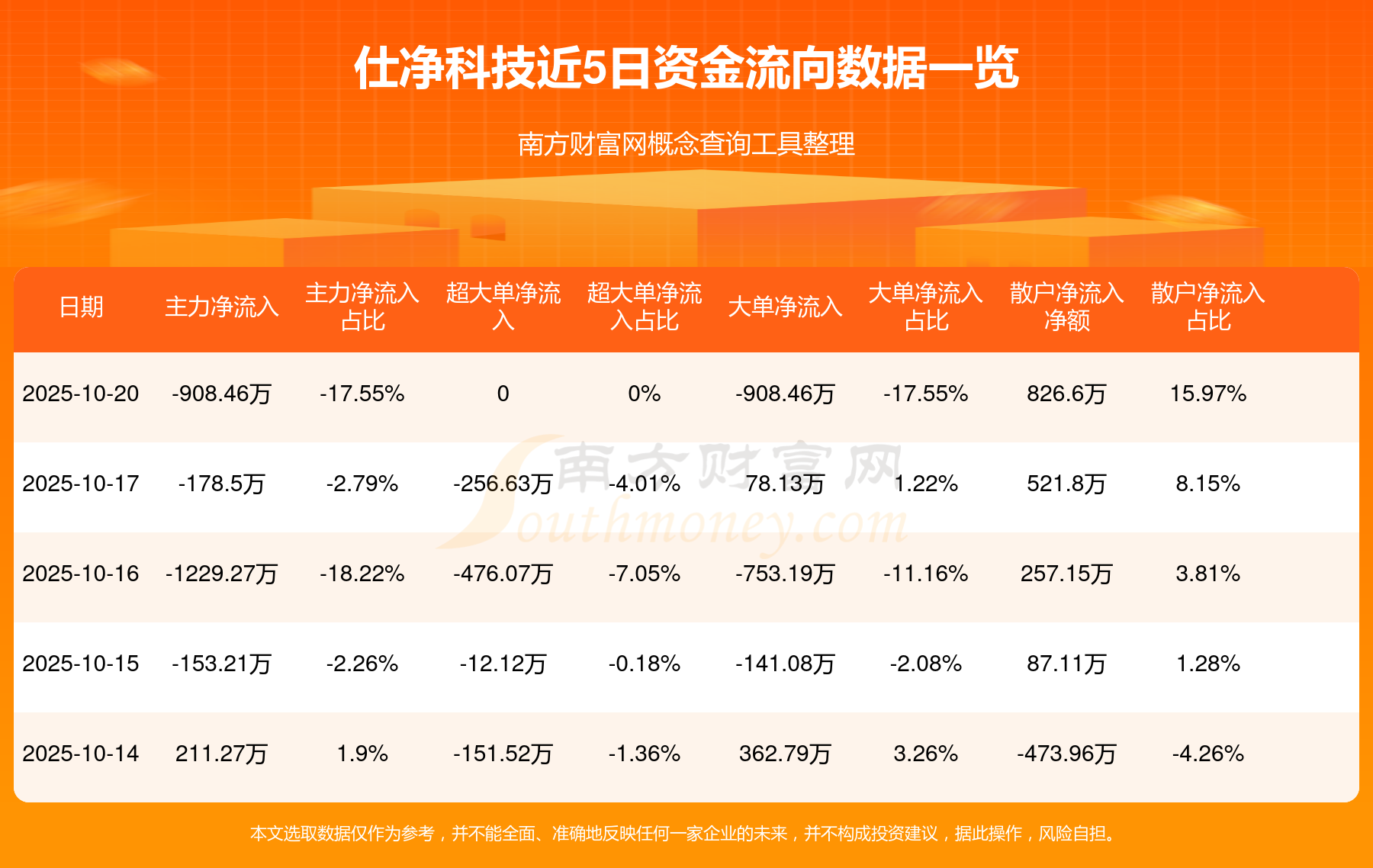 10月9日仕净科技3日内股价下跌2.19%,截至15时收盘,该股报14.630元涨1.19%,成交5177.02万元,换手率1.76%。
