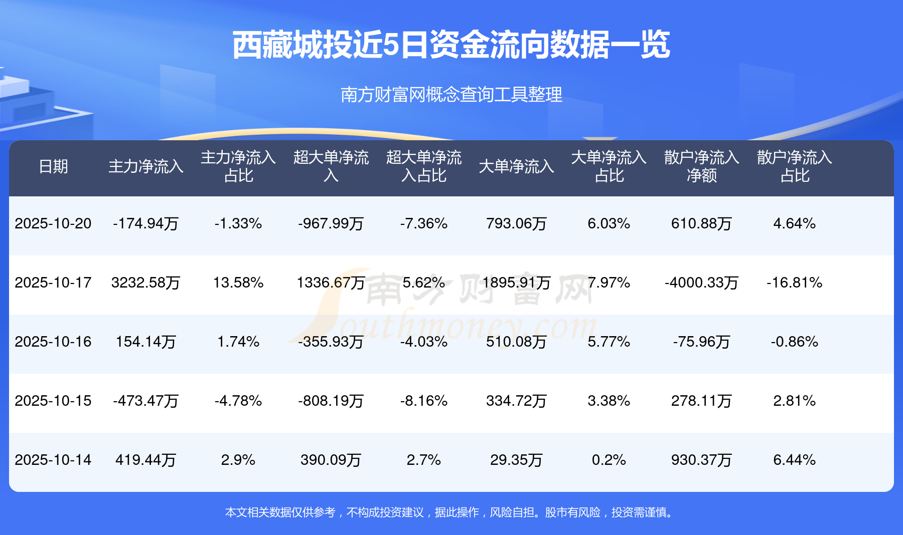 10月20日消息,西藏城投10月20日主力净流出174.94万元,超大单净流出967.99万元,大单净流入793.06万元,散户净流入610.88万元。
