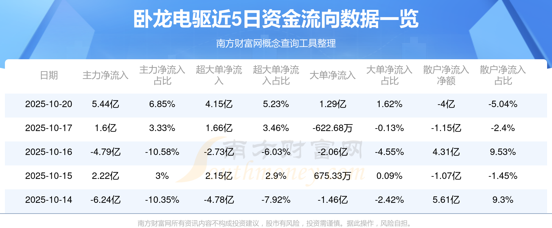 10月20日收盘最新消息,卧龙电驱今年来上涨64.35%,截至下午三点收盘,该股涨6.89%报48.220元 。