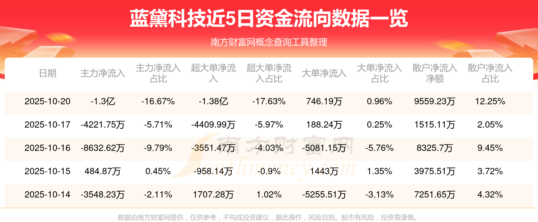 10月20日消息,蓝黛科技资金净流出1.3亿元,超大单资金净流出1.38亿元,换手率9.46%,成交金额7.8亿元。