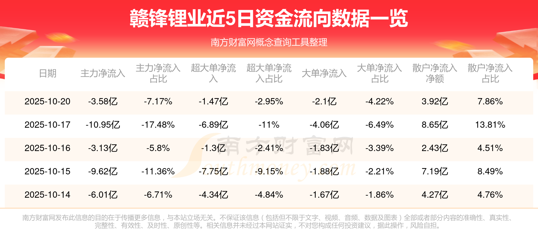 10月20日消息,赣锋锂业资金净流出3.58亿元,超大单净流出1.47亿元,换手率6.74%,成交金额49.88亿元。