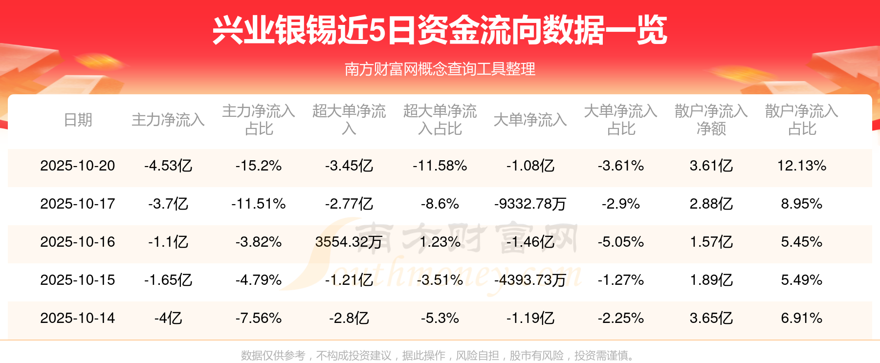 10月20日消息,兴业银锡10月20日主力资金净流出4.53亿元,超大单资金净流出3.45亿元,大单资金净流出1.08亿元,散户资金净流入3.61亿元。