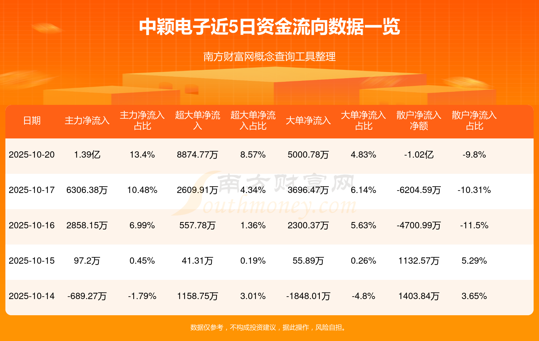 10月20日消息,中颖电子主力资金净流入1.39亿元,超大单资金净流入8874.77万元,散户资金净流出1.02亿元。