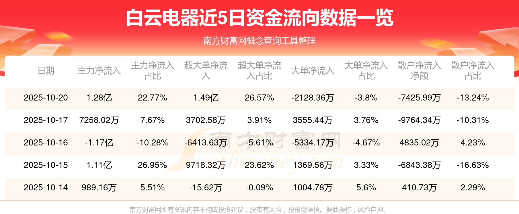 10月20日消息,白云电器10月20日主力资金净流入1.28亿元,超大单资金净流入1.49亿元,大单资金净流出2128.36万元,散户资金净流出7425.99万元。