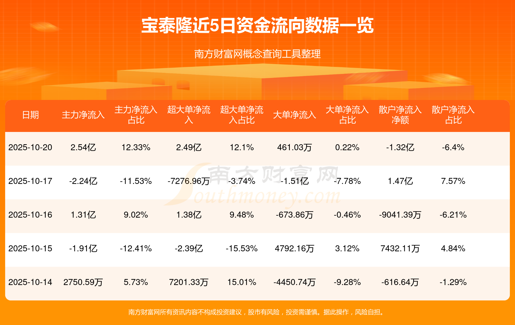 10月20日消息,宝泰隆主力资金净流入2.54亿元,超大单资金净流入2.49亿元,散户资金净流出1.32亿元。