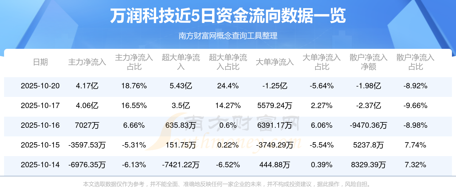 10月20日该股主力资金净流入4.17亿元,超大单资金净流入5.43亿元,大单资金净流出1.25亿元,中单资金净流出2.19亿元,散户资金净流出1.98亿元。