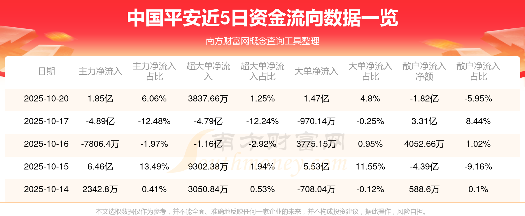 10月20日消息,中国平安10月20日主力资金净流入1.85亿元,超大单资金净流入3837.66万元,大单资金净流入1.47亿元,散户资金净流出1.82亿元。