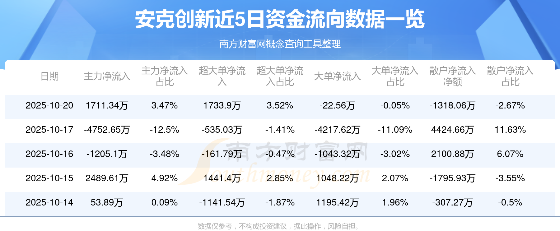 资金流向数据方面,10月20日主力资金净流流入1711.34万元,超大单资金净流入1733.9万元,大单资金净流出22.56万元,散户资金净流出1318.06万元。