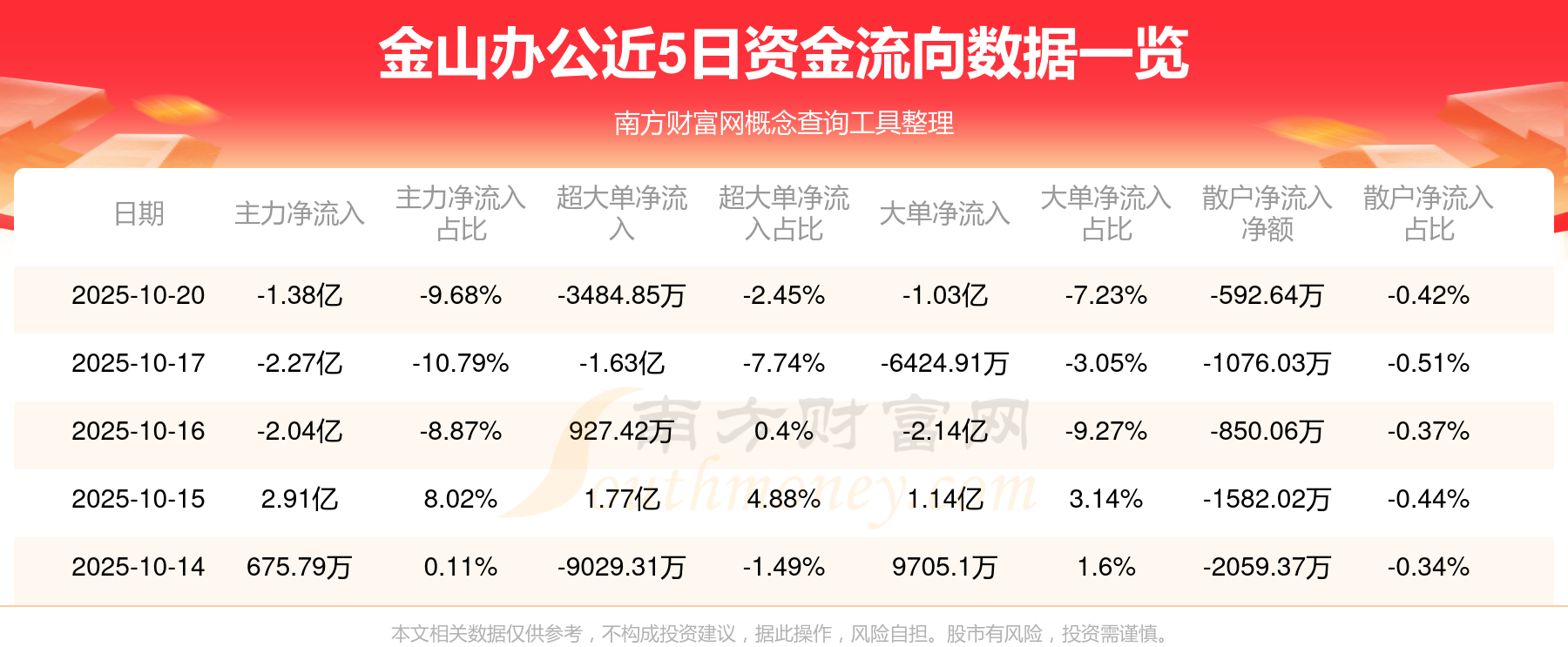 10月20日消息,金山办公10月20日主力净流出1.38亿元,超大单净流出3484.85万元,大单净流出1.03亿元,散户净流出592.64万元。