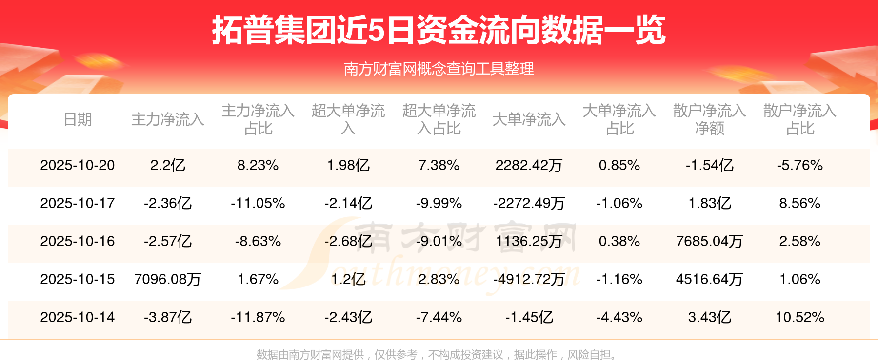 10月20日消息,拓普集团10月20日主力资金净流入2.2亿元,超大单资金净流入1.98亿元,大单资金净流入2282.42万元,散户资金净流出1.54亿元。