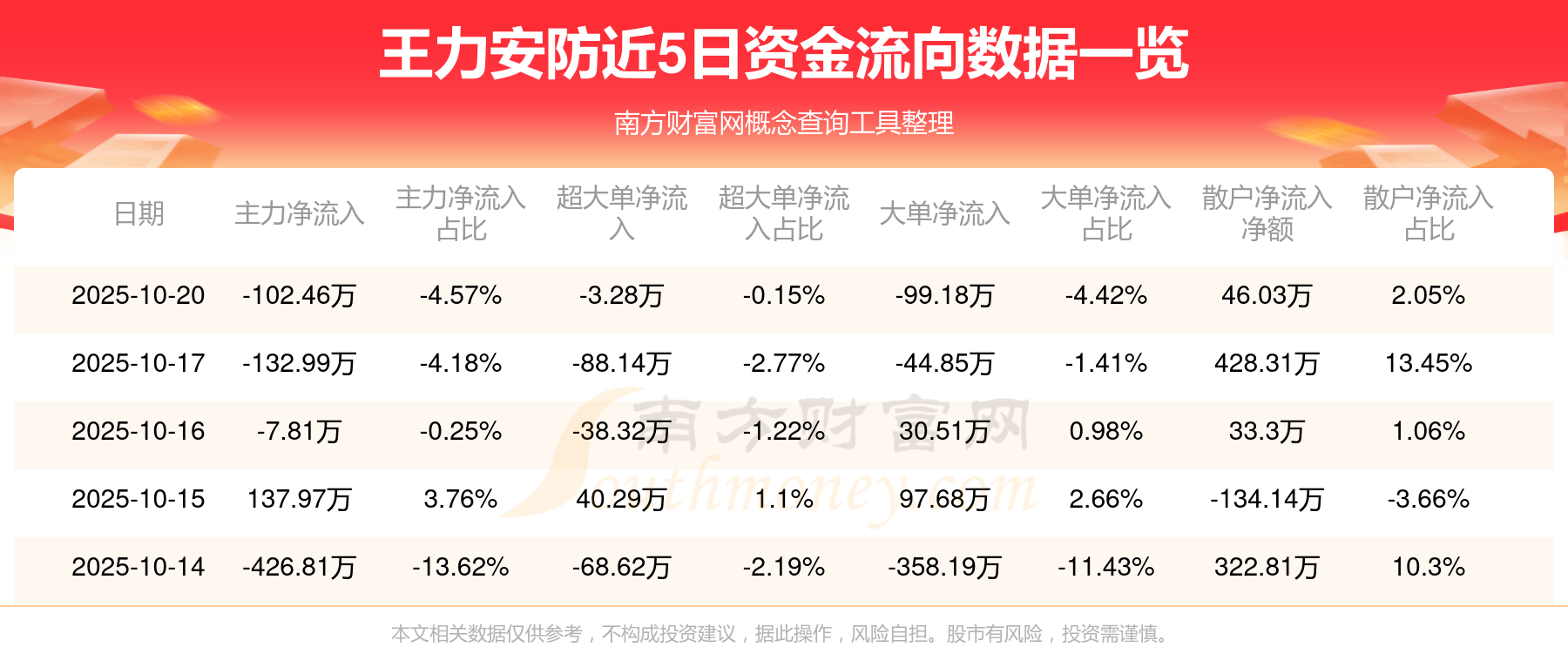 10月20日消息,王力安防主力净流出102.46万元,超大单净流出3.28万元,散户净流入46.03万元。