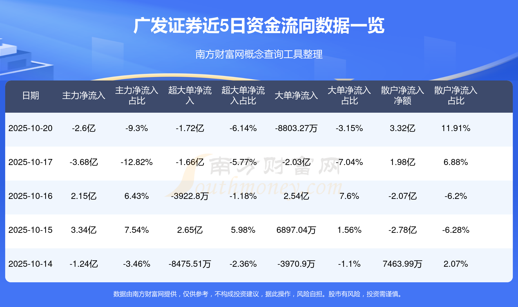 10月20日消息,广发证券资金净流出2.6亿元,超大单资金净流出1.72亿元,换手率0.61%,成交金额8.19亿元。
