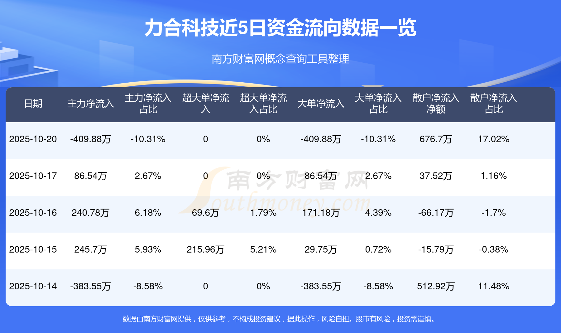 10月20日消息,力合科技10月20日主力净流出409.88万元,大单净流出409.88万元,散户净流入676.7万元。