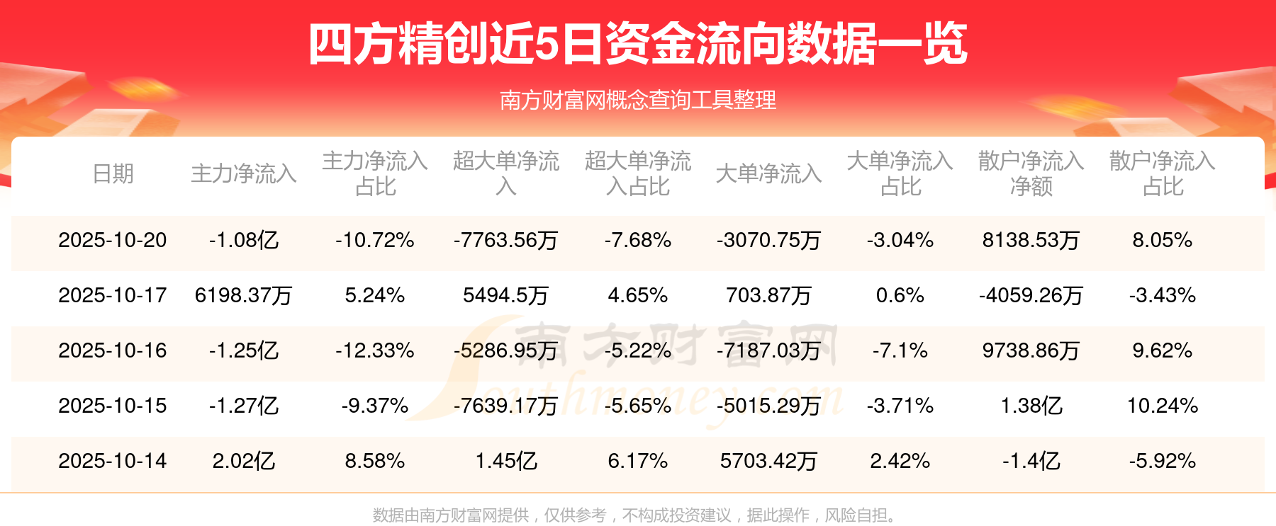 10月20日消息,四方精创资金净流出1.08亿元,超大单资金净流出7763.56万元,换手率2.11%,成交金额4.15亿元。