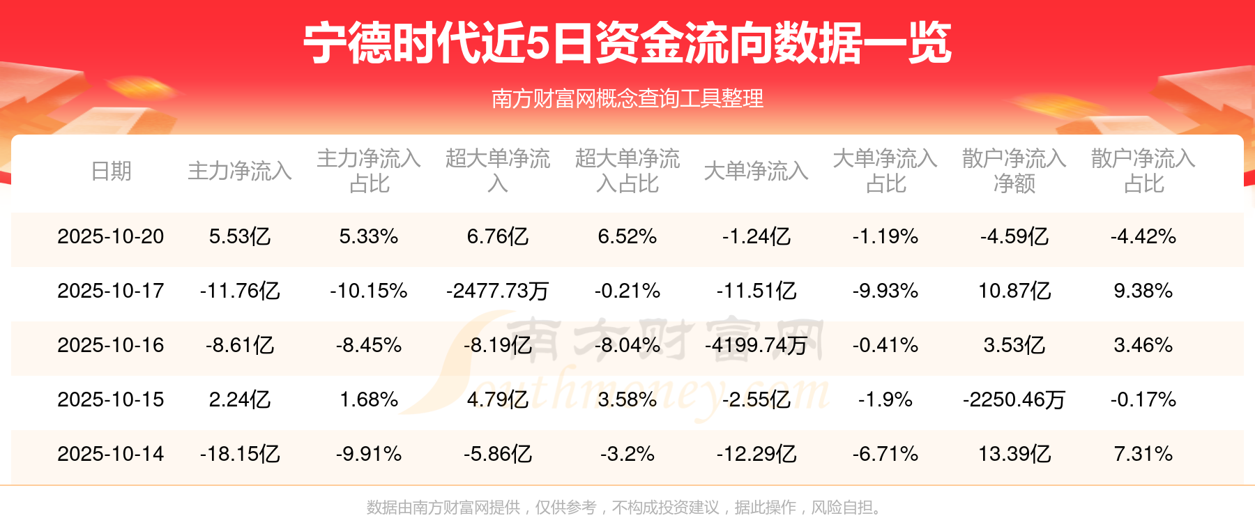 10月20日消息,宁德时代主力净流入5.53亿元,超大单净流入6.76亿元,散户净流出4.59亿元。