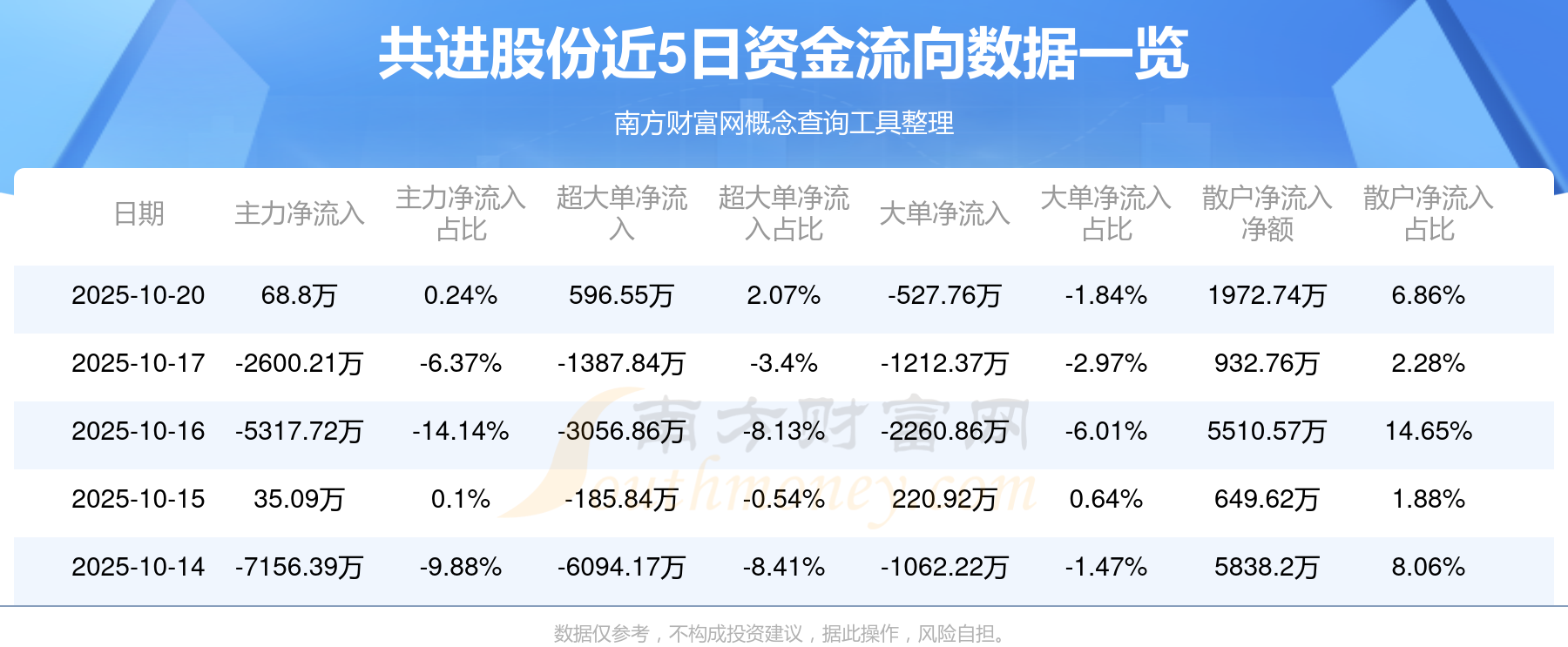10月20日消息,共进股份主力资金净流入68.8万元,超大单资金净流入596.55万元,散户资金净流入1972.74万元。