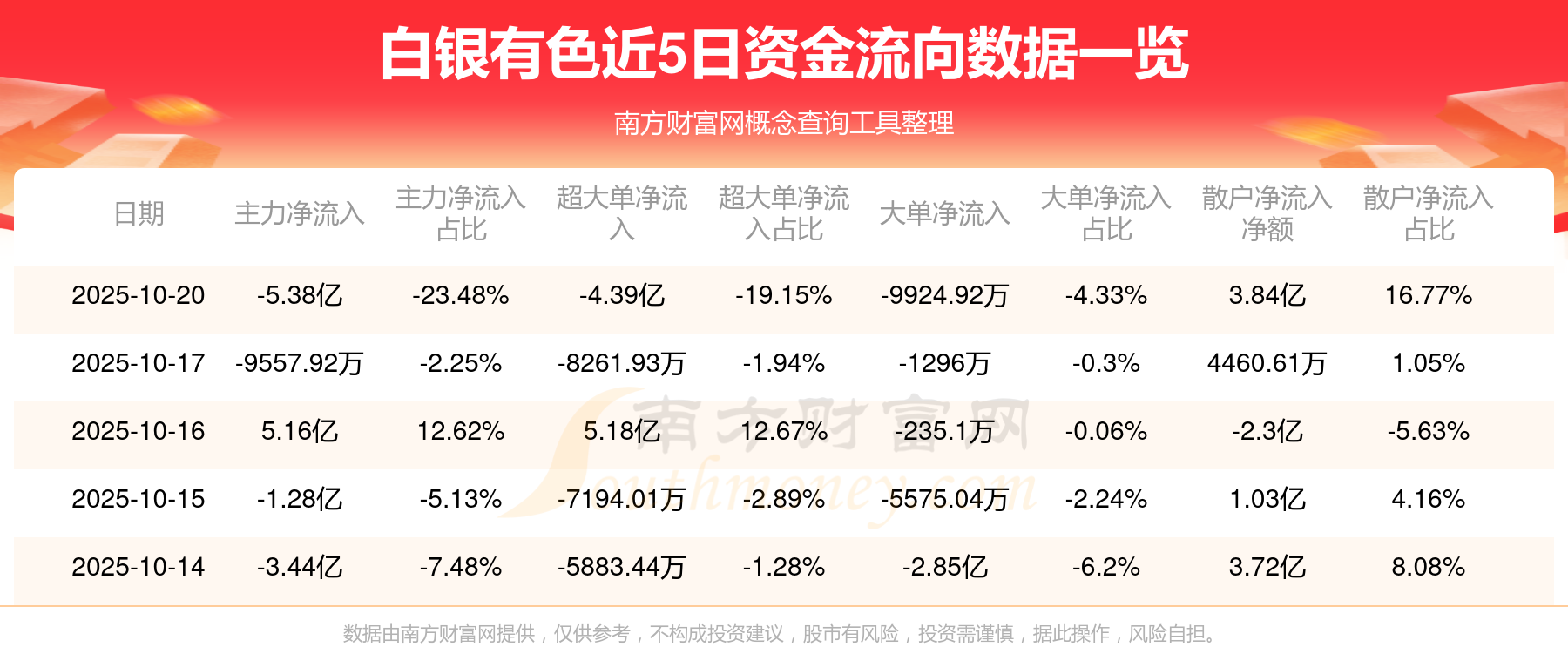 10月20日消息,白银有色主力资金净流出5.38亿元,超大单资金净流出4.39亿元,散户资金净流入3.84亿元。