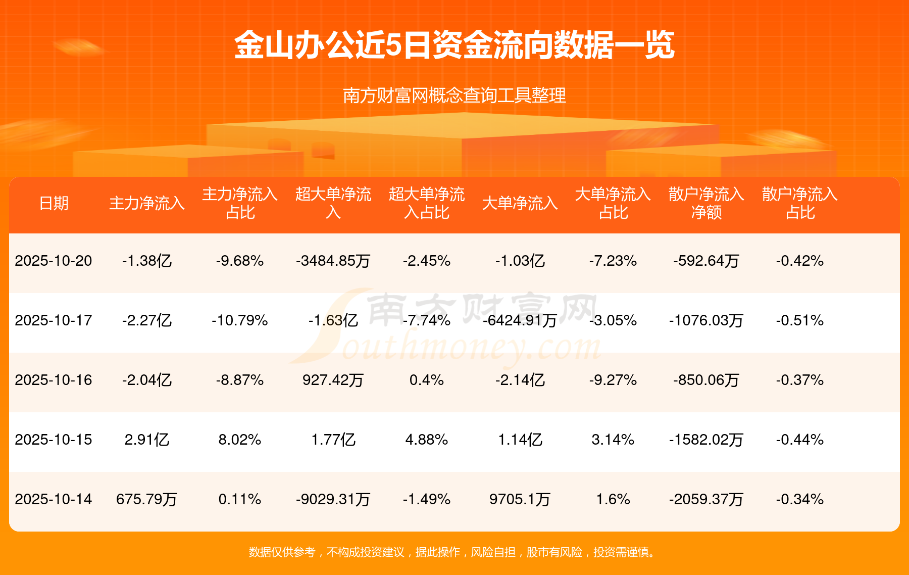 10月20日消息,金山办公10月20日主力资金净流出1.38亿元,超大单资金净流出3484.85万元,大单资金净流出1.03亿元,散户资金净流出592.64万元。