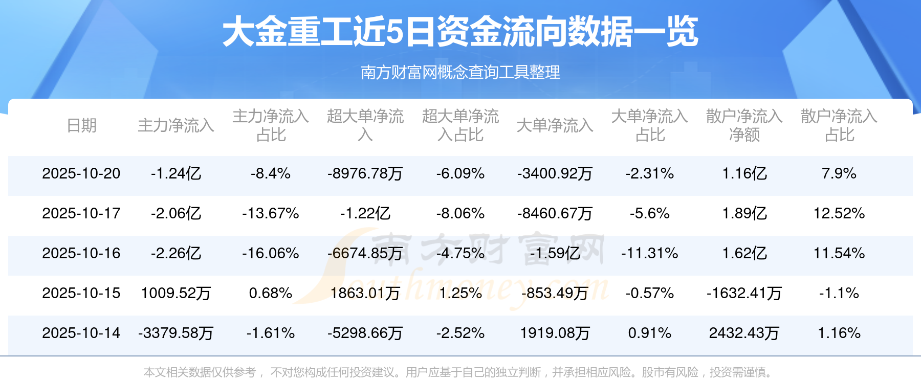 10月20日消息,大金重工资金净流出1.24亿元,超大单净流出8976.78万元,换手率3.99%,成交金额11.84亿元。