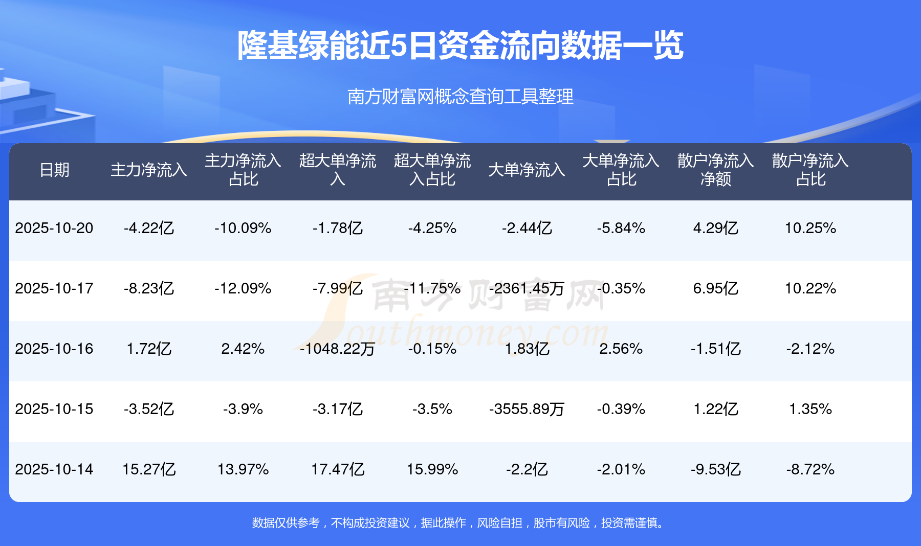 10月20日消息,隆基绿能主力净流出4.22亿元,超大单净流出1.78亿元,散户净流入4.29亿元。