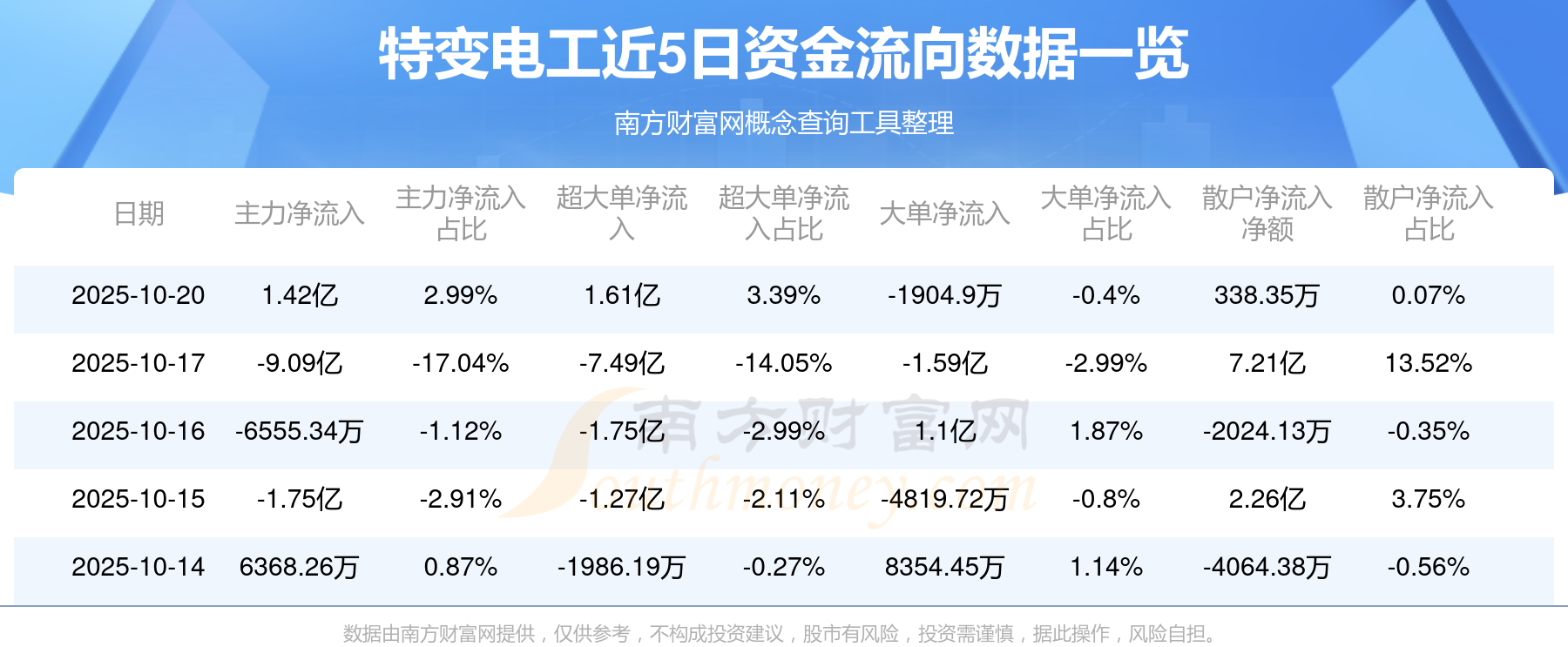 10月20日该股主力资金净流入1.42亿元,超大单资金净流入1.61亿元,大单资金净流出1904.9万元,中单资金净流出1.46亿元,散户资金净流入338.35万元。