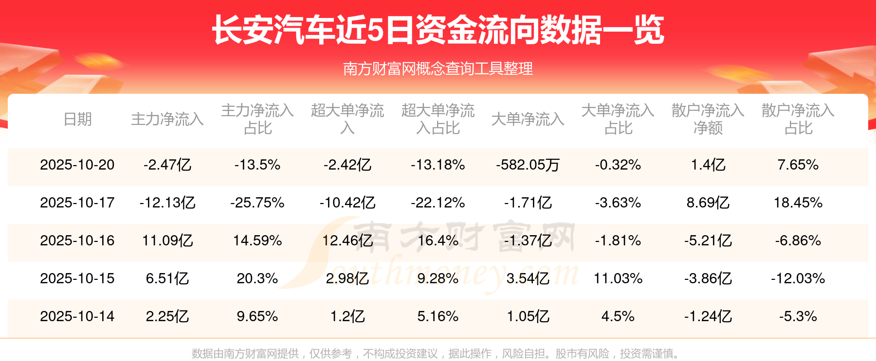 10月20日消息,长安汽车10月20日主力资金净流出2.47亿元,超大单资金净流出2.42亿元,大单资金净流出582.05万元,散户资金净流入1.4亿元。