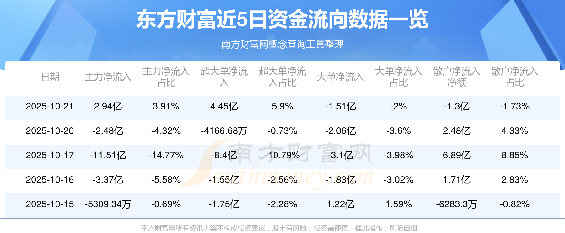 10月21日消息,东方财富主力资金净流入2.94亿元,超大单资金净流入4.45亿元,散户资金净流出1.3亿元。