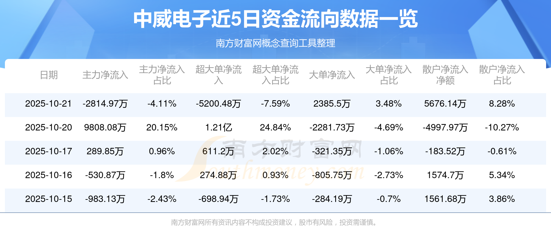10月21日消息,中威电子主力净流出2814.97万元,超大单净流出5200.48万元,散户净流入5676.14万元。
