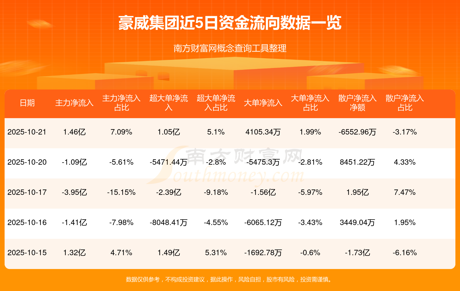 10月21日该股主力资金净流入1.46亿元,超大单资金净流入1.05亿元,大单资金净流入4105.34万元,中单资金净流出8084.92万元,散户资金净流出6552.96万元。