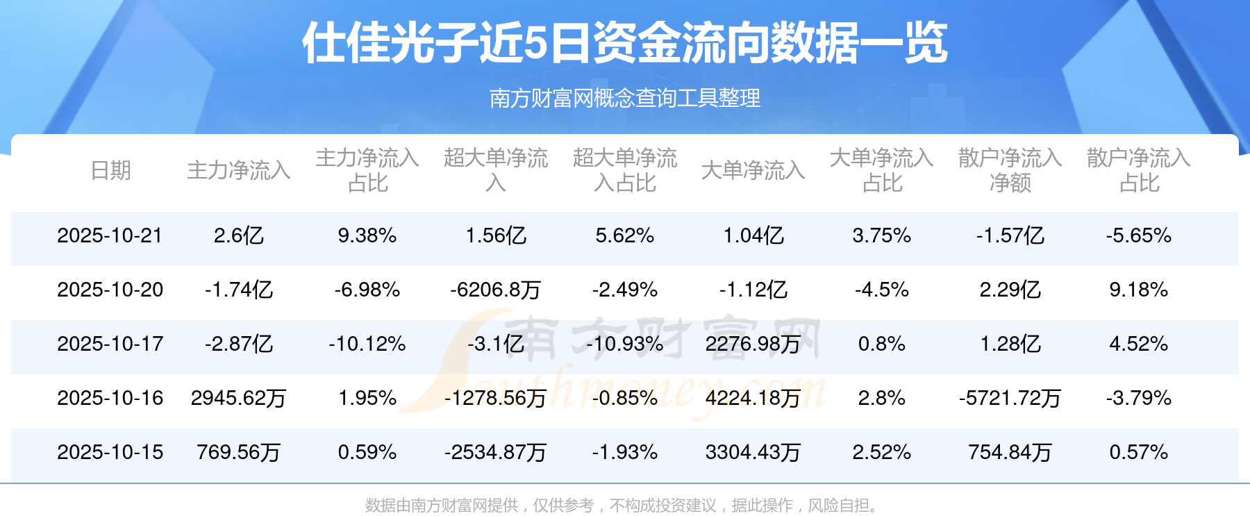 10月21日消息,仕佳光子主力净流入2.6亿元,超大单净流入1.56亿元,散户净流出1.57亿元。