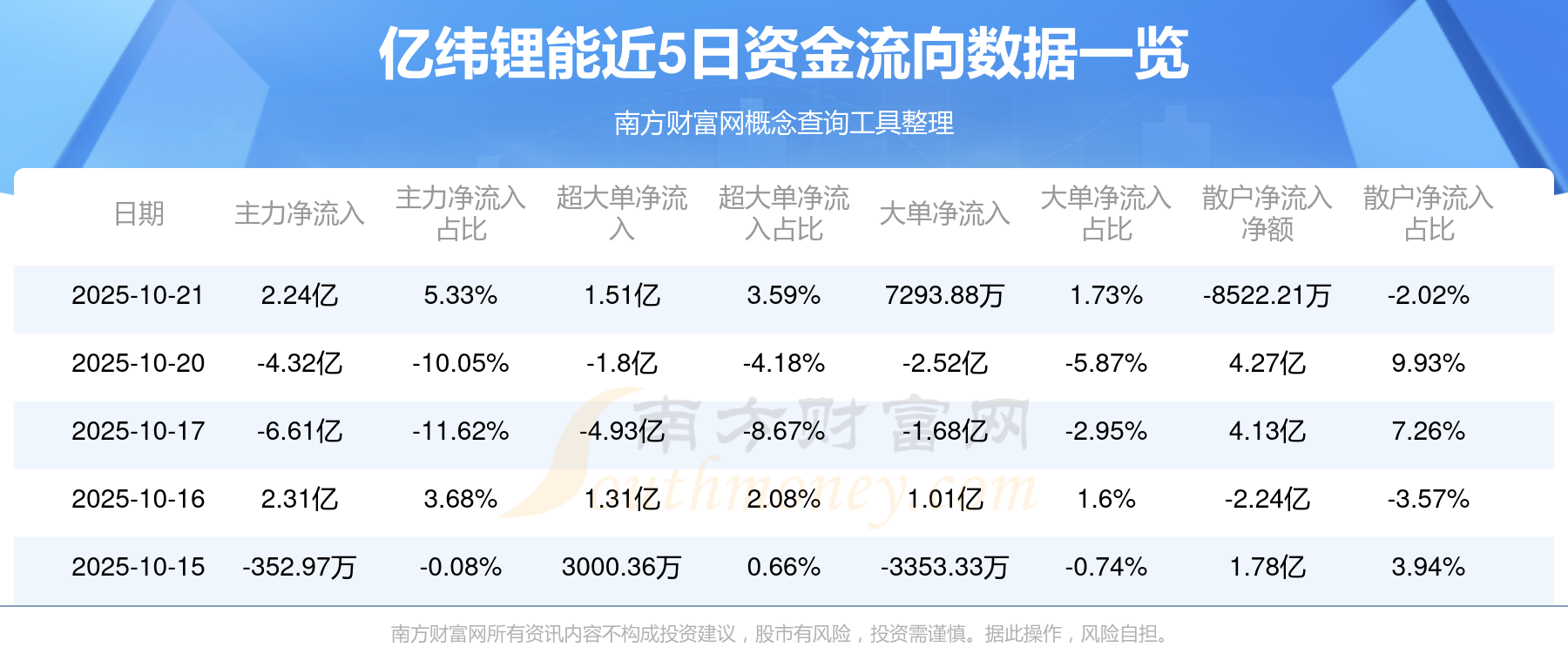 10月21日消息,亿纬锂能10月21日主力资金净流入2.24亿元,超大单资金净流入1.51亿元,大单资金净流入7293.88万元,散户资金净流出8522.21万元。