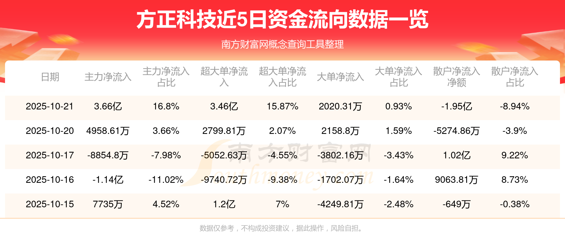 10月21日消息,方正科技10月21日主力资金净流入3.66亿元,超大单资金净流入3.46亿元,大单资金净流入2020.31万元,散户资金净流出1.95亿元。