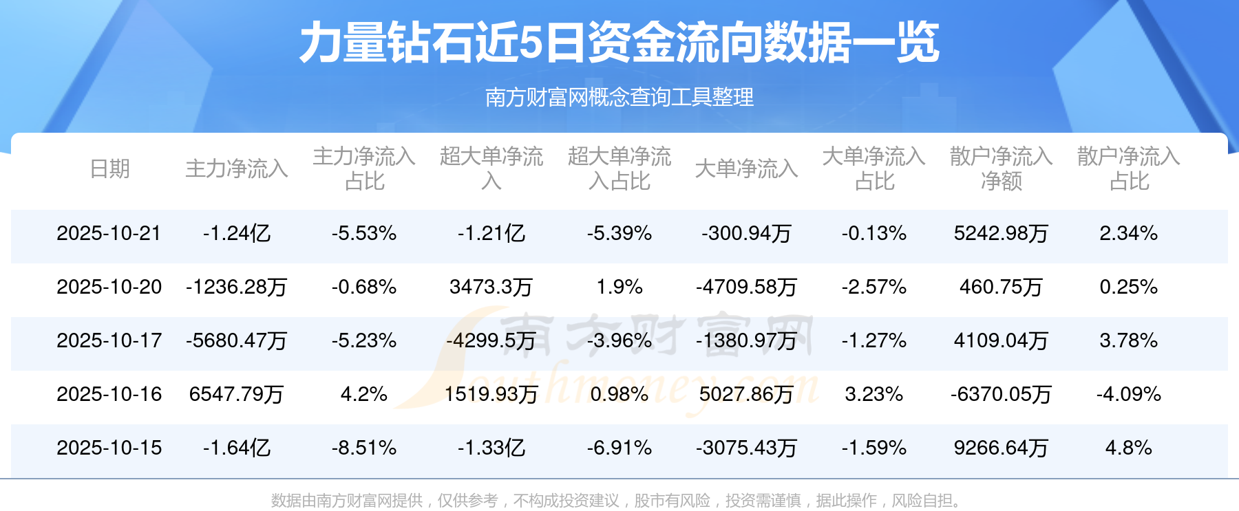 10月21日消息,力量钻石主力资金净流出1.24亿元,超大单资金净流出1.21亿元,散户资金净流入5242.98万元。