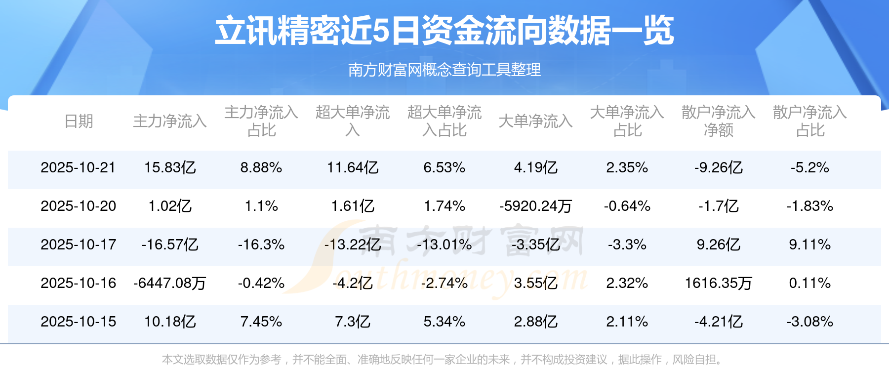 10月21日消息,立讯精密资金净流入15.83亿元,超大单资金净流入11.64亿元,换手率4.03%,成交金额178.21亿元。