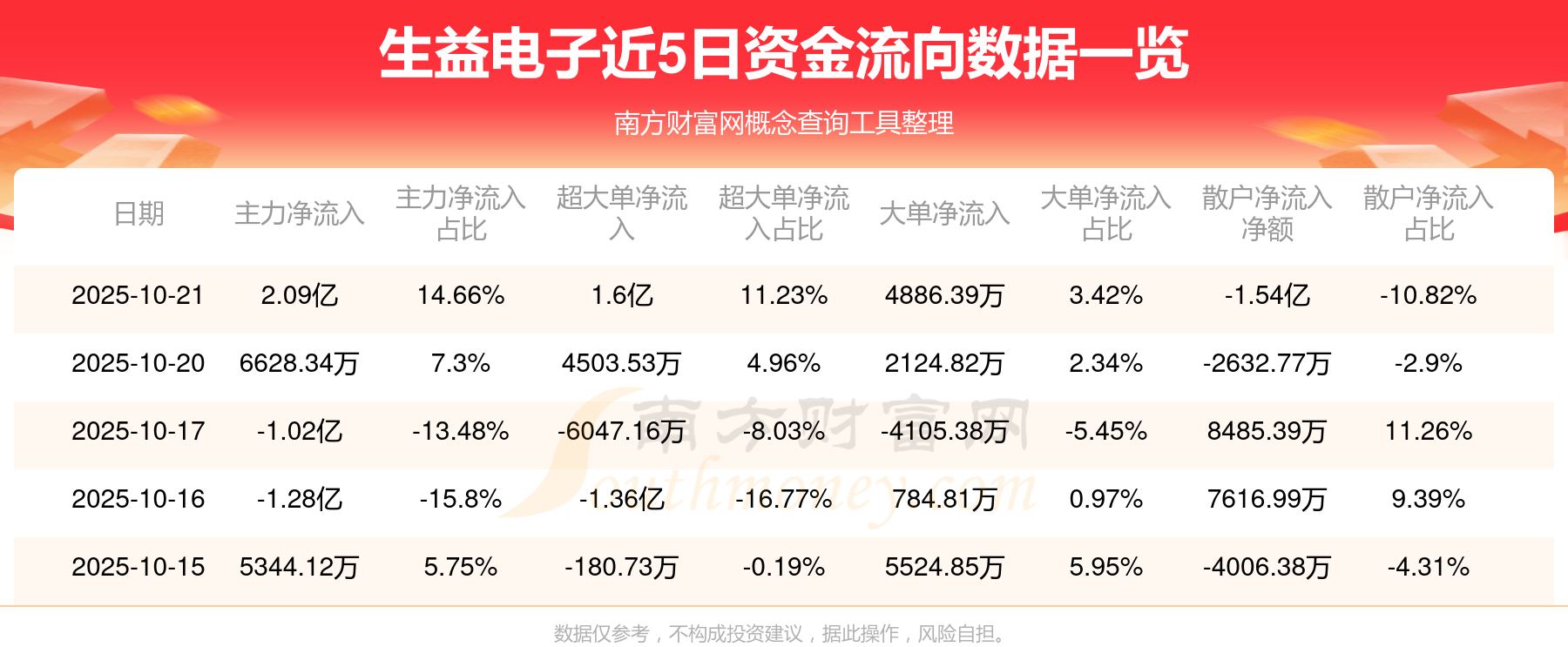 10月21日消息,生益电子10月21日主力资金净流入2.09亿元,超大单资金净流入1.6亿元,大单资金净流入4886.39万元,散户资金净流出1.54亿元。
