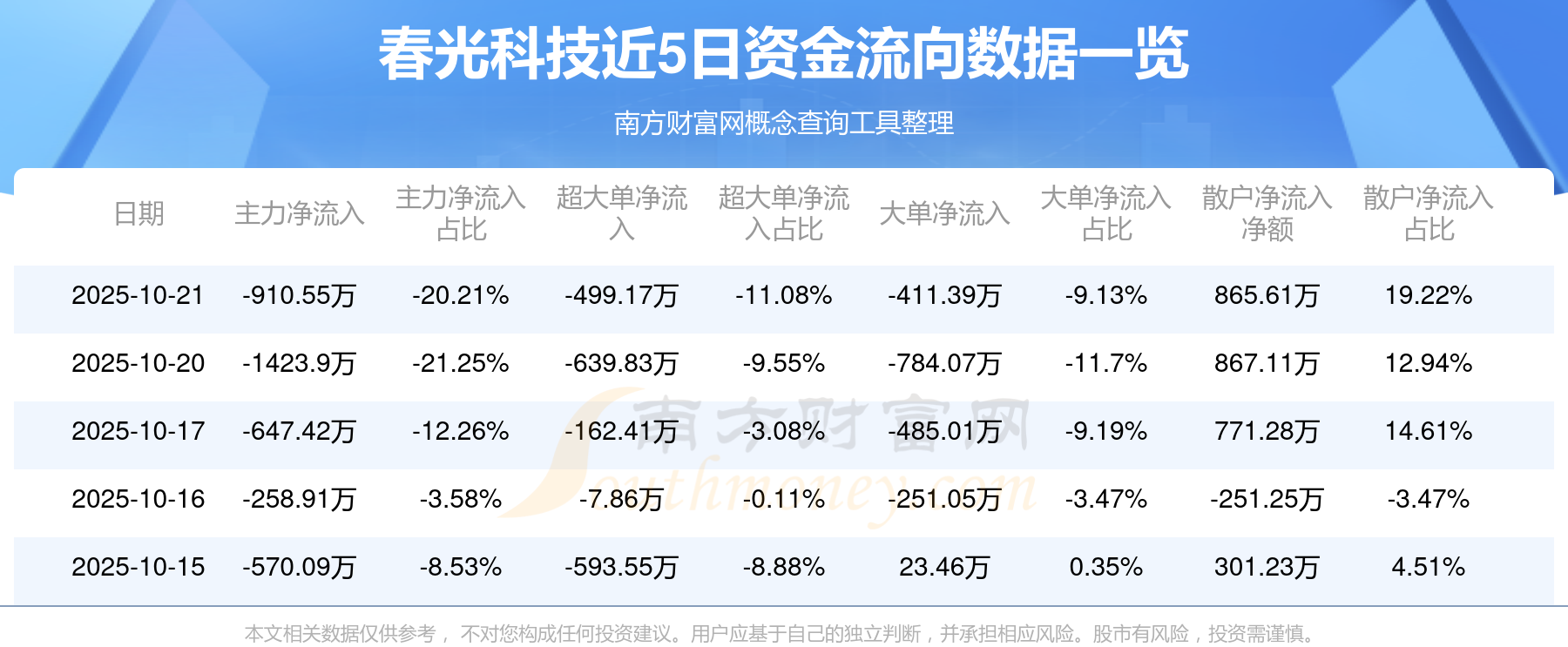 10月21日消息,春光科技主力资金净流出910.55万元,超大单资金净流出499.17万元,散户资金净流入865.61万元。