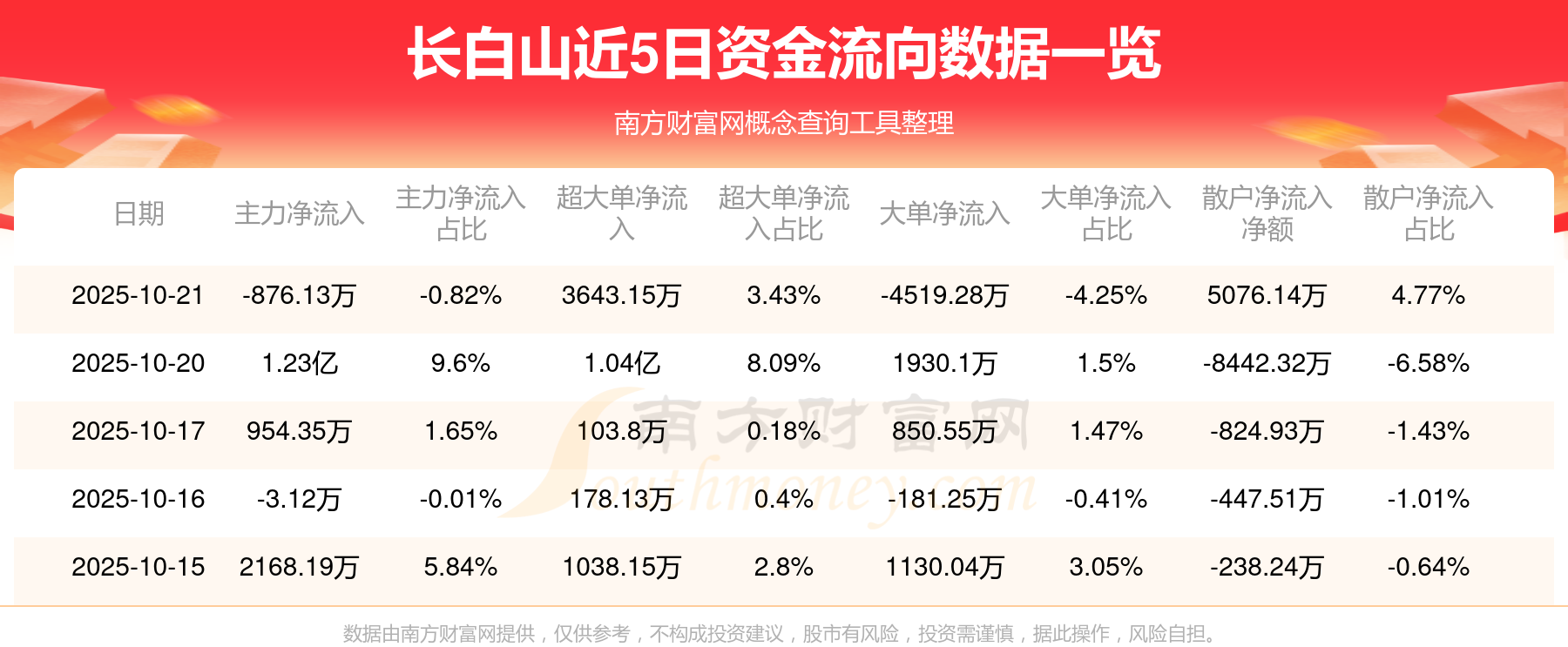 10月21日消息,长白山10月21日主力净流出876.13万元,超大单净流入3643.15万元,大单净流出4519.28万元,散户净流入5076.14万元。