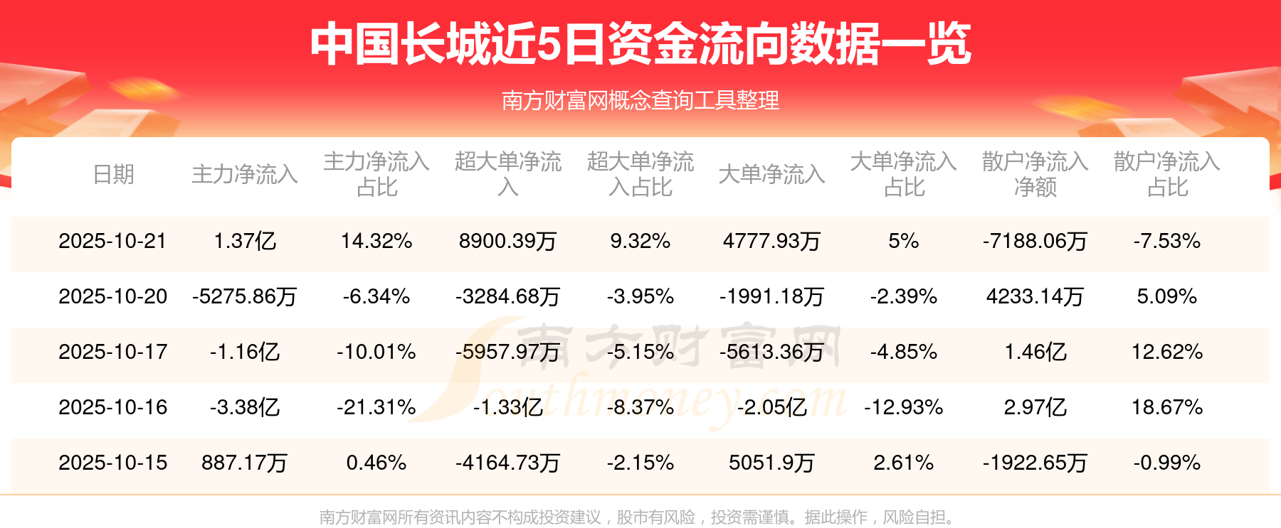 10月21日消息,中国长城10月21日主力净流入1.37亿元,超大单净流入8900.39万元,大单净流入4777.93万元,散户净流出7188.06万元。