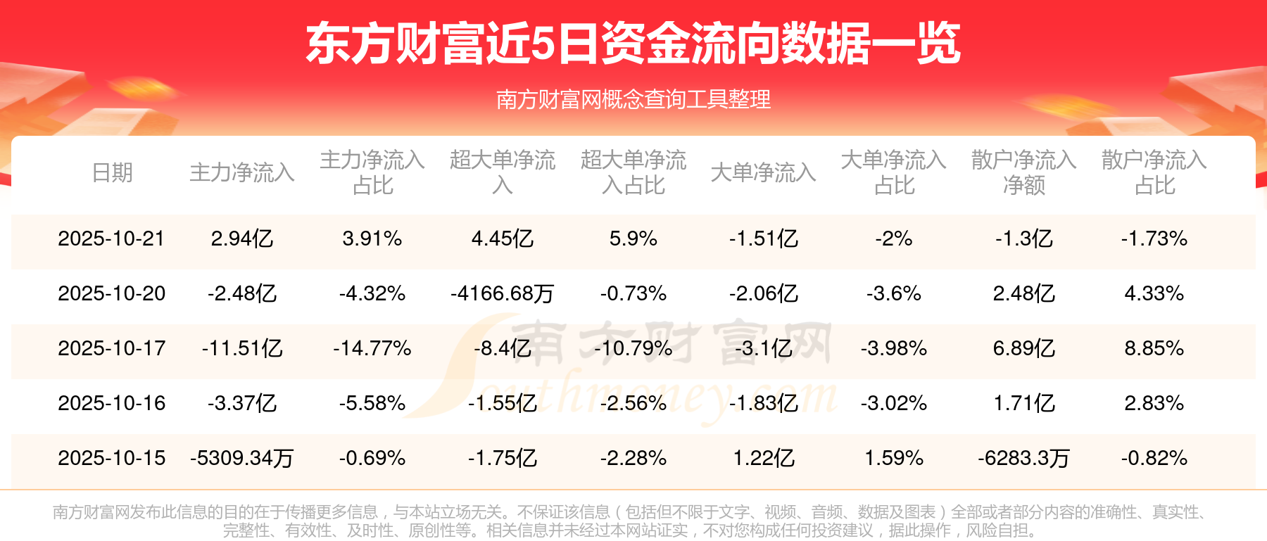 10月21日消息,东方财富资金净流入2.94亿元,超大单净流入4.45亿元,换手率2.22%,成交金额75.31亿元。