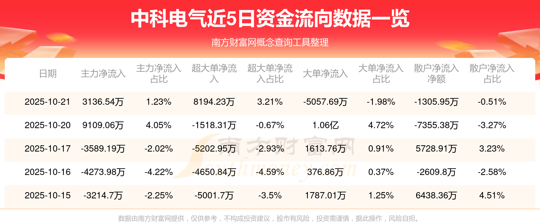 10月21日消息,中科电气10月21日主力净流入3136.54万元,超大单净流入8194.23万元,大单净流出5057.69万元,散户净流出1305.95万元。