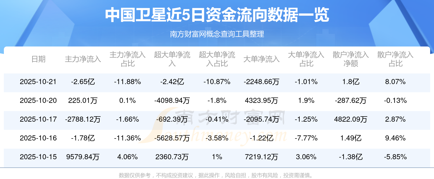 10月21日消息,中国卫星10月21日主力资金净流出2.65亿元,超大单资金净流出2.42亿元,大单资金净流出2248.66万元,散户资金净流入1.8亿元。