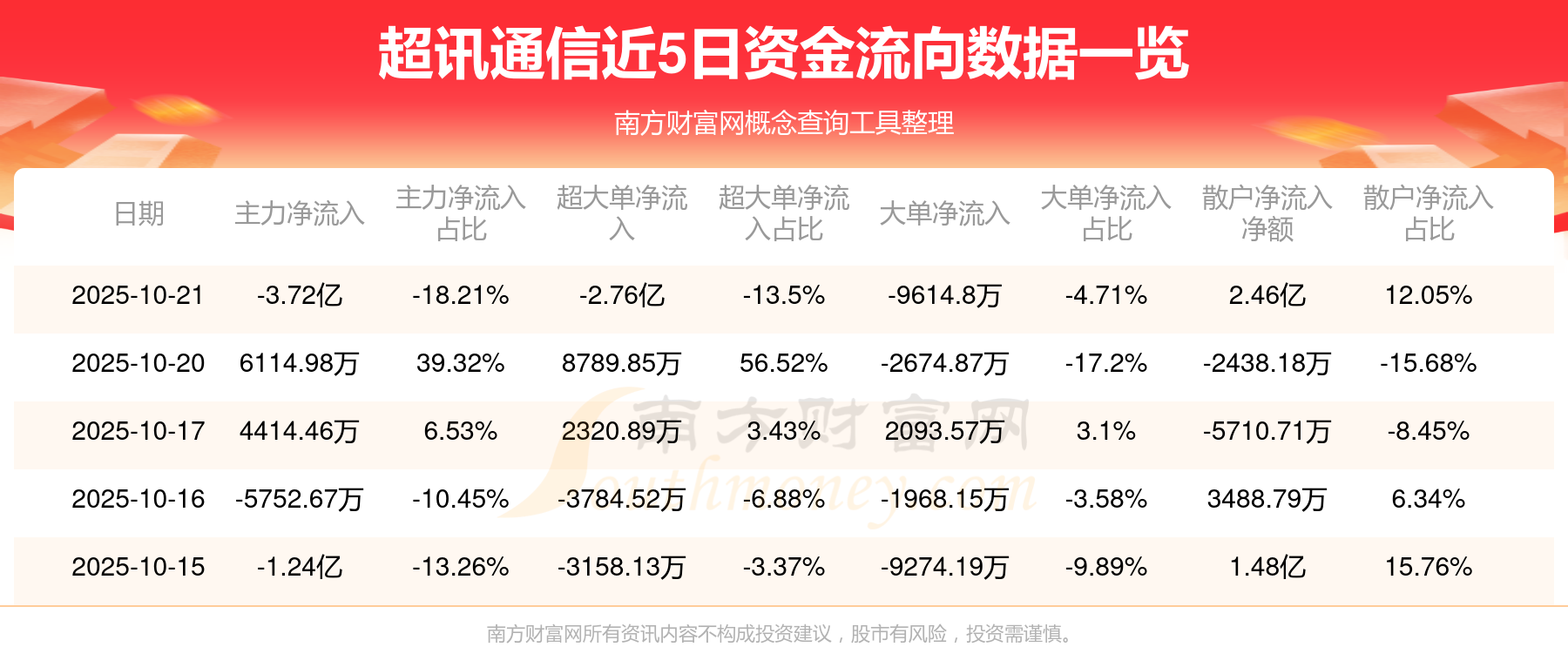 10月21日消息,超讯通信10月21日主力资金净流出3.72亿元,超大单资金净流出2.76亿元,大单资金净流出9614.8万元,散户资金净流入2.46亿元。