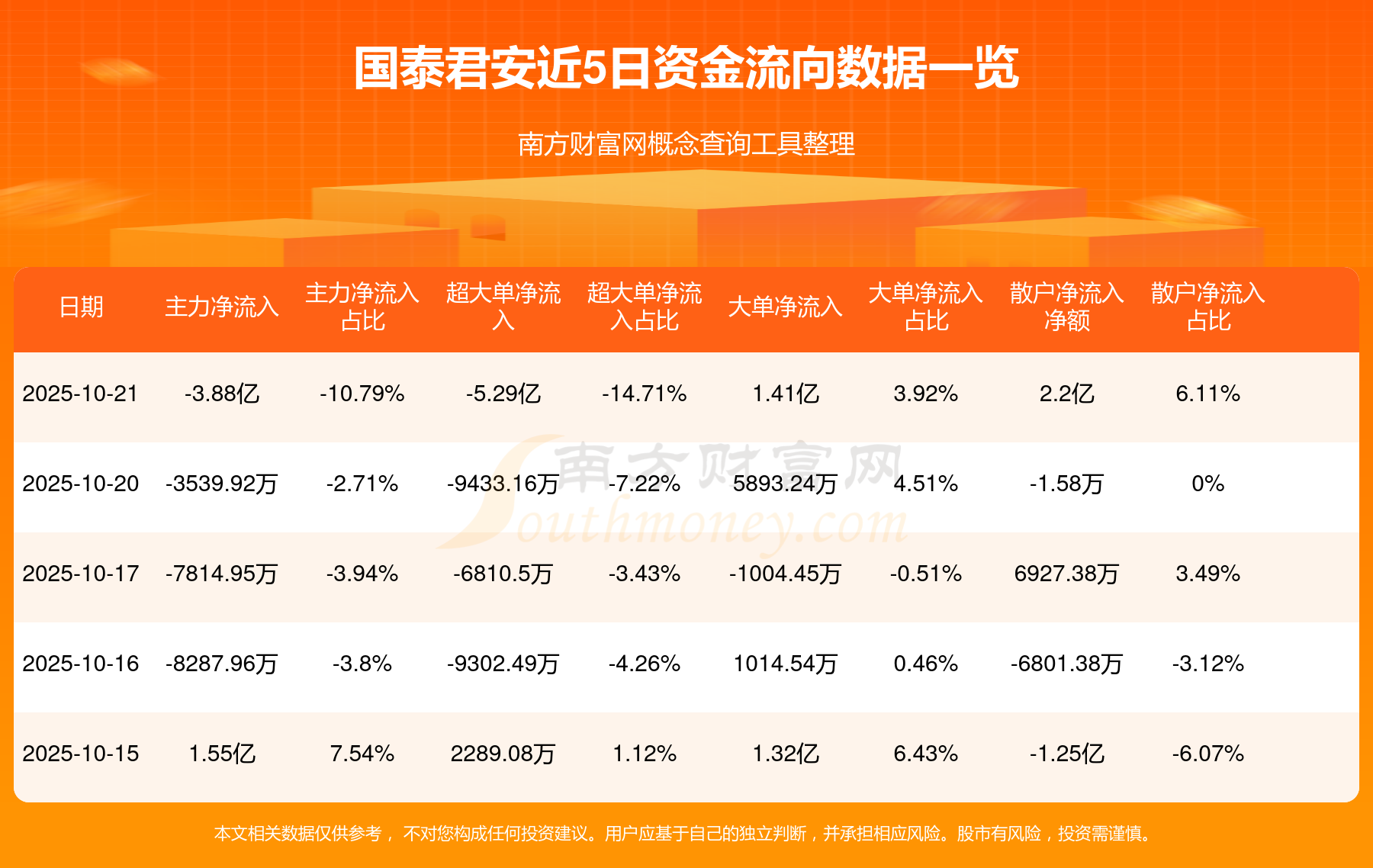 10月21日消息,国泰海通10月21日主力净流出3.88亿元,超大单净流出5.29亿元,大单净流入1.41亿元,散户净流入2.2亿元。